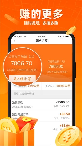 【按单结算,随时提现】收入按单结算,多劳多得,灵活提现。