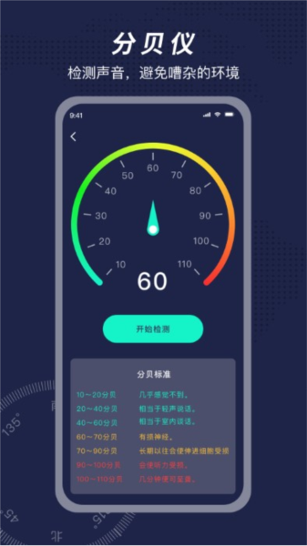 7, 工具集合: 提供水平仪、分贝仪、量角器、直尺、手电筒等多种工具