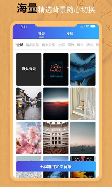 3、时钟精美壁纸:多种主题自由定制,不同时钟、自定义背景图片,切换多个时钟背景