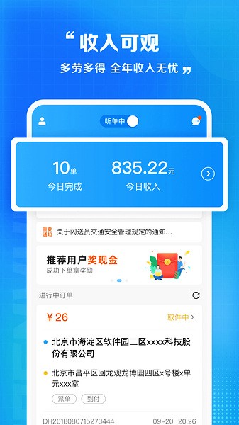 闪送骑士APP官方版针对优秀闪送员可获取闪送价格全部收入的100%,针对其他闪送员,会扣除20%的佣金。目前大多数闪送员,每天干5单能赚200以上,接单越多,挣得越多!