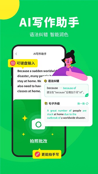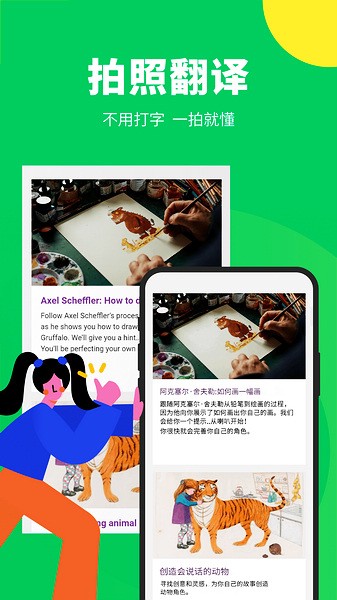 - 拍照翻译:图书、试题、路牌、菜单、广告单...随手拍照,即时获取翻译结果。
