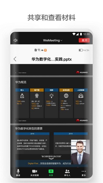 1080P高清视频,4K超清数据共享,支持屏幕共享、电子白板、会中聊天、实时弹幕、同声传译、会议空间,协作更高效