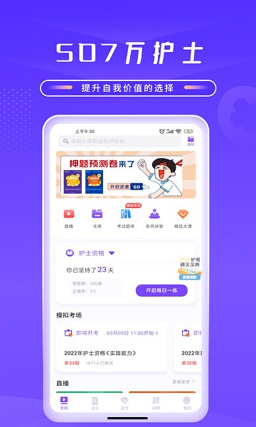 护士最受青睐的学习中心,护考汇集百万考生关注,通关全靠它了!护理部智库、每日一练、8万道题库、模拟考场、出国考试、临床护理、50项护理操作、考试宝典。