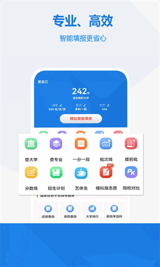 1、智能匹配: 根据考生高考分数、排名、省份和文理科等数据,测算出可冲击、较稳妥和可保底的报考大学,同时提供详细的学校分析报告。