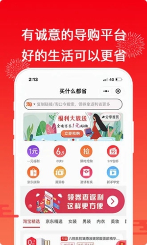 买什么都省APP是一款主打优惠购物的软件,界面简洁清爽,汇集海量优质商品,丰富齐全种类繁多,囊括家居、美妆、食品、服装、母婴等应有尽有,满足用户的购物需求,同时软件网罗天猫、淘宝、京东、拼多多等各大主流电商平台隐藏优惠券,买前快速查券,一键轻松领取,让你购物省省省!在成功购物后,还能享受返现福利,1元起提,极速秒到账,让你更安心!快来下载试试看吧!