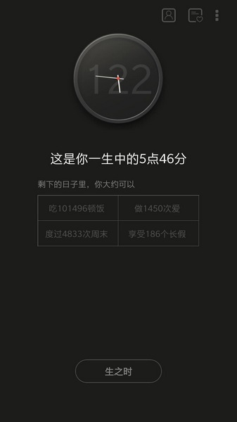 1、界面非常简洁,一股清流扑面而来。进入软件之后会让你选择你的出生日期,调节好之后即可进入"生之时"页面,这里会罗列出你在这个世界上存在的年、月、周、天、小时、分钟数。