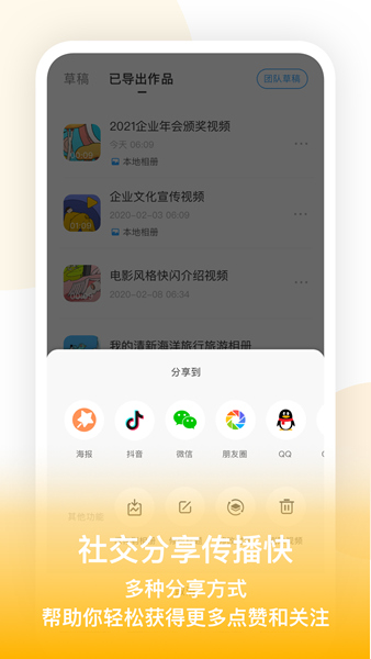 5、点击分享,可以将自己制作的视频分享至微信、QQ、微博等多个社交软件