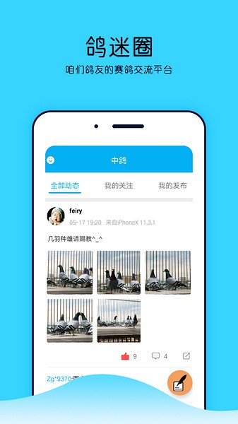 8、鸽迷圈随拍随发,记录养鸽心情,分享美丽信鸽瞬间,留住赛鸽精彩视频。