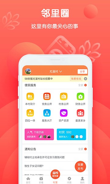 益村app是一款专门为广大农民们打造的智慧乡村综合服务平台,通过该软件用户们可以十分轻松的了解到村里各种各样的村务事项。同时,村干部上益村可以发布党务公开、村务公开,发起村民议事等等,村民们也可以查补贴、找工作、找对象、找工匠,学习农技知识、咨询各类生产生活问题等等,为大家生活带来更加便捷的服务。