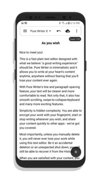 蕴繁于简,您能够最快速度达到灵感页面,能够随时随地中断和继续写作,能够快速指纹加密您的文本,能够轻易、快速将文本分享发送到其他 App,这些我们都已经为您做好了。