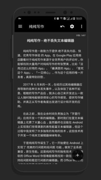 纯纯写作破解版是一款主打在线写作编辑的软件,如果想要找随时随地都能进行写作的话,那么这款软件便是一个不错的选择,其不仅界面清爽直观,使用体验也相当出色,并拥有相当丰富的写作功能可供用户进行使用,且全程使用无广告,为你带来更加优质的创作体验!同时用户还能通过软件自行设定字间距、段落间距、字体大小等参数,还可恢复历史记录,以避免文本丢失,此外,该版本可以免费使用高级版功能,非常实用!