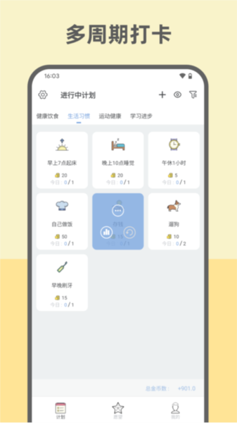 每一项打卡任务都可以设置完成打卡后可获得的自我激励额度,以及未完成打卡任务的惩罚额度。