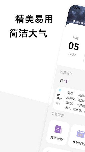 美遇日记app是一款画面简约,功能也非常丰富的日记本软件,通过该软件用户们可以随时随地打开来记录生活中发生的各种事件,不论是写日记、写文章、做笔记还是记录旅游等等全都可以,可以很好的满足大家的使用需求。此外,平台内的操作也非常具有人性化,轻轻点击就可以记录,让大家可以写下你的每一个美好日记瞬间,记录完成后也能快速进行储存。