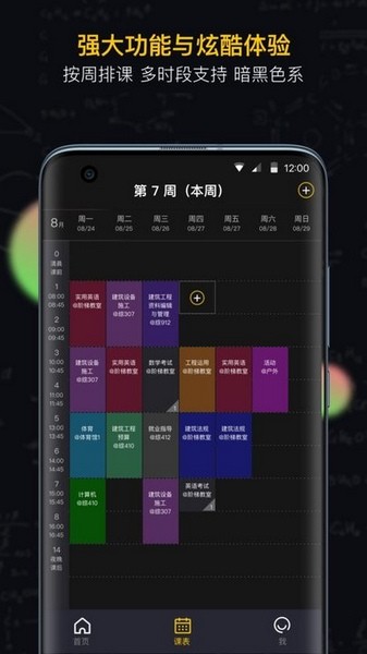 小书桌课表是一款便捷实用的手机课程表软件。这款软件可以让用户智能导入最新的课程表,可以绑定不同用户的课程表,随时切换查看,方便家长使用。软件会将不同课程使用不同的颜色用以区分,背景颜色以黑色系为主,让字体和课程颜色更加的明显清晰。此外,用户可以将课程表导出为pdf文件再进行打印。