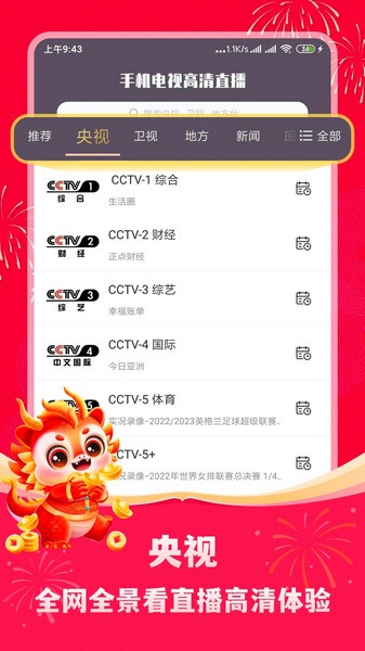 【央视】囊括cctv1、cctv6、cctv新闻、cctv3、cctv4、cctv5、cctv5+、央视频道、体育直播、实况足球、天下足球、中超、英超、欧冠、西甲、意甲、法甲、cba、nba、怀旧剧场、世界地理、兵器科技等热门央视影音视频,任何央视频道新闻生活资讯、新闻联播、焦点访谈、新闻直播间、地理中国、探索发现、天气预报、军事纪实、国家记忆、海峡两岸、直播港澳台等都可流畅高清观看。