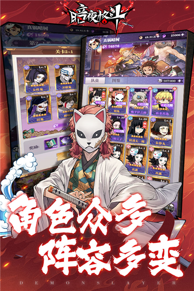 2、顶级队伍,任你差遣炭治郎、炼狱杏寿郎、蝴蝶香奈惠、猗窝座等等顶级英雄,皆在你的掌控中!