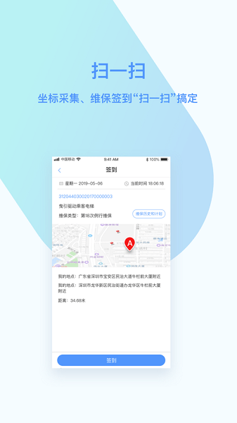 1、扫码签到:扫描使用标志上的二维码即可签到,无需手动输入电梯设备注册代码