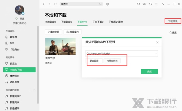 4、用户还可以点击界面上的下载目录设置歌曲或mv的保存位置,用户可以点击更改目录,选择合适的目录位置。如果用户已经下载完成但找不到在哪里,可以点击打开文件夹选项,直接就可以到文件的下载位置,用户就能够快速找到下载的歌曲文件。