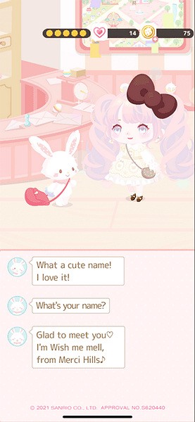 有点麻烦同时也是后期最常出现的互动形式。任务形式是三丽鸥小伙伴需要别的伙伴的某样素材,拜托你去取得交给她/他。举例玉桂狗需要音符草,接受任务后,需要去美乐蒂的花店帮忙,获取音符草(帮助美乐蒂获得的素材是随机的)。当获取到音符草后,此时玉桂狗的房子上会出现绿色勾勾,再次点击进入,进行对话框互动即完成任务。