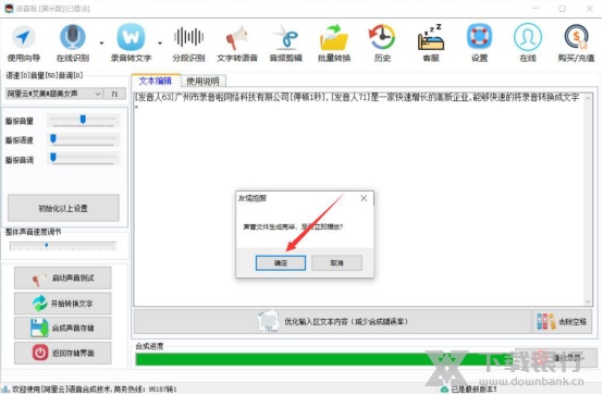 5.当转换完成的时候,它会弹出如下图的提醒窗口,说明录音啦已经将文字转换成语音了。用户点击“确定”按钮即可立即播放。