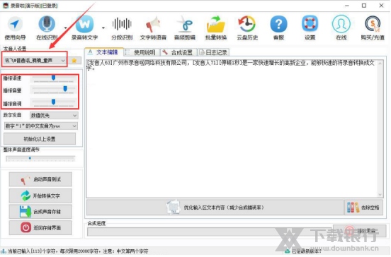 3.此时,在录音啦的左侧栏中,可以根据自己的需要设置发音人、播报的语速、音量、音调。设置完成后,在右侧的“文本编辑”区域输入或者粘贴需要录音啦转语音的文字。