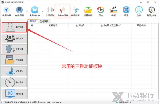 2.然后,在录音啦文字转语音的操作界面中,可以在左侧看到它有单人发音、多人发音、文本朗读这三个常用的功能。本文点击选用最常用的“单人发音”。