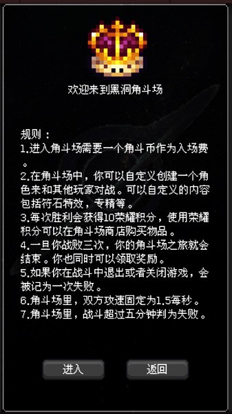 像素世界冒险黑洞角斗场是一款像素风的冒险放置手游,整个游戏画面都采用了复古的像素风格,同时其中还为玩家们准备了非常丰富的冒险角色可以选择体验,并且不同的角色拥有不一样的战斗方式和技能,给大家带来不一样的游戏体验。在这里玩家们可以通过击杀敌人和怪物来获得材料、装备以及提升自己的等级等等,但是随着等级的提升,怪物也会变得更加强大,给大家更大的挑战。
