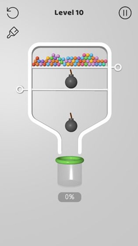 2、游戏玩法很有趣,你需要按不同的顺序去掉瓶中的别针让瓶子上方的彩球顺利进入到出口外才能通关。