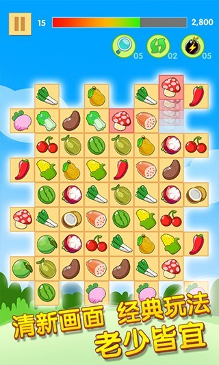1、经典的连连看模式,玩家将相同的水果连接消除就可以了。