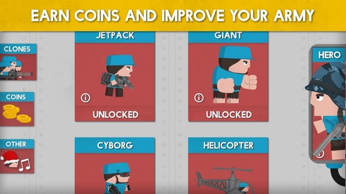 “克隆群体”有很多在每个任务令人振奋的惊喜具有挑战性的任务。是聪明的同时使您的克隆,因为它会做同样的举动,你已经做过的事情。游戏的设计是这样一种方式,有不同的方式来完成任务。用你的战略思维能力和完成任务。赚取胸部般的胶囊获得奖励,收集强大的新单位和设备和升级现有的。选择你自己的单位和不同的克隆,从迷你枪挥舞士兵喷气包或罐设计你的军队。快来和真棒游戏力学和直观的控制发挥最冒险的军事游戏。