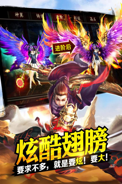 这款游戏的玩法非常的简单,对玩家没有太多的要求,超级炫酷的游戏翅膀,在这样简单的游戏世界中进行就是一个字:炫;自由的游戏玩法,在进行游戏的时候一定要炫酷,展示自己的超级魅力,游戏中还有超多精彩的游戏玩法,还有超萌的宠兽相随,这个江湖注定不简单。