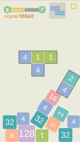 在方块落下的时候要找到数字相同的方块叠放在一起,这样就会消除同样的方块,这样一直消除方块直到左上方的进度条满了就成功过关,不能让积木搭满,搭满了就输了。