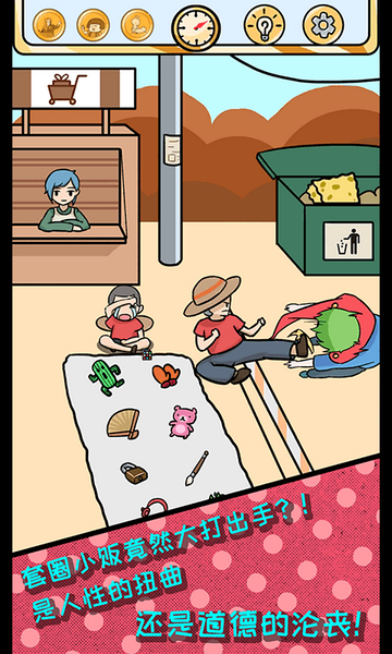 玩这款游戏就像在看一本荒诞的漫画,每个关卡都充满脑洞和惊喜。你需要帮助欧皇吉良吉绿摆脱她的“欧气”,完成各种奇怪的任务。比如第二关要让非洲人买饮料,第11关要用刀划破卡片抽卡,这些操作真是让人哭笑不得。