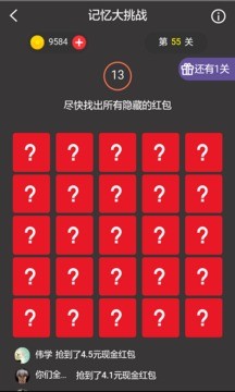 App里有超过100个关卡,难度逐渐升级,从简单到复杂,挑战你的记忆极限。特别是那些考验记忆力的游戏,比如记住九宫格红包的位置然后点击,听起来有点难,但我还是想试试看自己是不是“记性好”。每次通关还能获得奖励,感觉像是一场有趣的冒险。