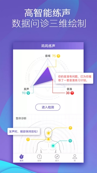 呜呜练声,独创声音跑分测试,全方位分析个人声音数据;创新教学模式,边练边测,实时反馈,让你练得精确不伤嗓;针对歌声弱项,提供科学练声方案,轻松唱好歌。