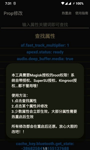 利用Magisk resetprop功能制作的Prop修改工具,故获取Magisk授权的ROOT权限后才可使用。