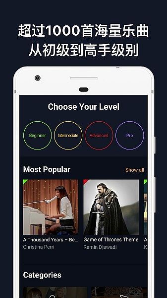 1、超过1000首曲目,从初级到高级、从古典到流行乐供你选择。