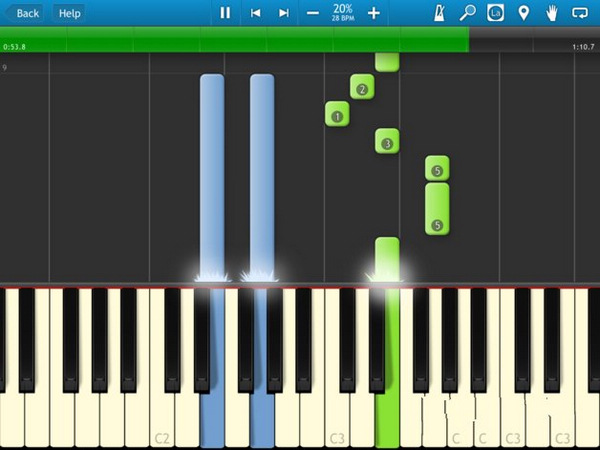 在“旋律实践”模式里,Synthesia会一直等到您弹对了正确的音符。可以左手或右手单手练习,也可以双手一起练习。