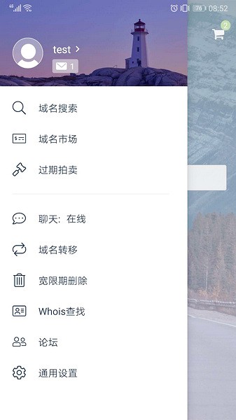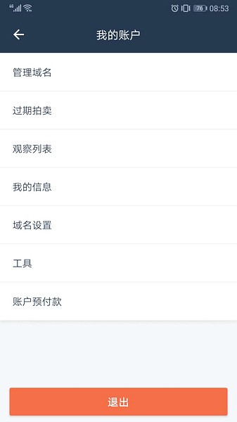4、返回主界面,点击左上角的三条线,我们可以看到相关功能,包括域名市场、过期拍卖、聊天、域名转移、宽限期删除等;