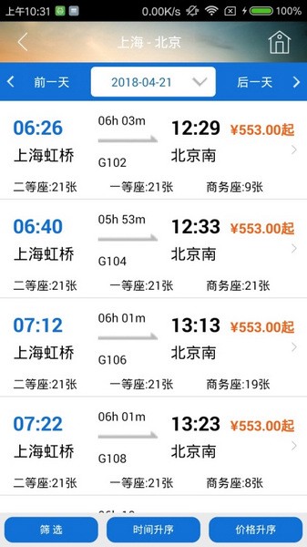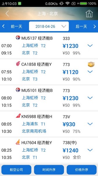 5、丰富的航班基本信息,每一条航班上面都显示价格折扣、和时间等信息,还突出展示合作公司图标;
