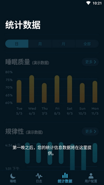 5、在统计中可看到系统统计的睡眠资料、规律性数据