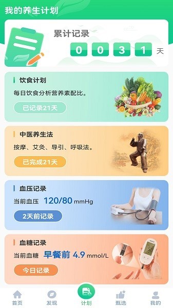 提供饮食计划,对自己的三餐实现营养素智能提示,及不适宜食用的食物提示。提供中医养生法,每日智能提供不同的导引方法,达到保健功效。