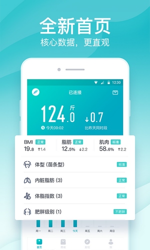 --BMI、体脂率、肌肉、基础代谢率、水分、脂肪重量、蛋白质、骨量、身体年龄等全面专业的身体数据报表,让你随时掌握自己的身体数据,有效、有针对性的改良