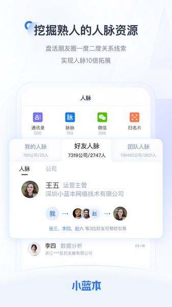 -人脉组队:与微信群友共享人脉资源,小蓝本实现人脉圈子10倍扩展。
