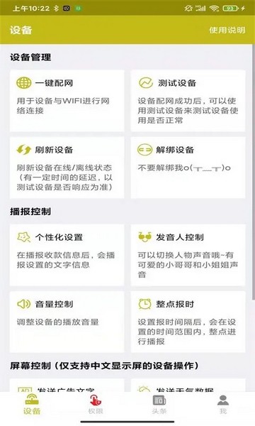 1、该应用主要用于控制设备播放收款信息、闹钟、整点提醒等。