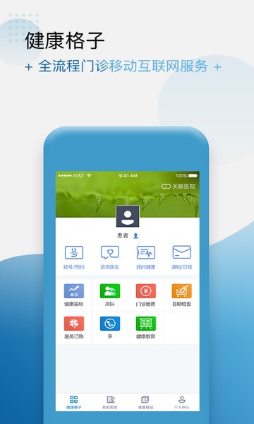 我的健康、我的通知、健康指标、排队、预约挂号、咨询医生、门诊缴费、自助服务