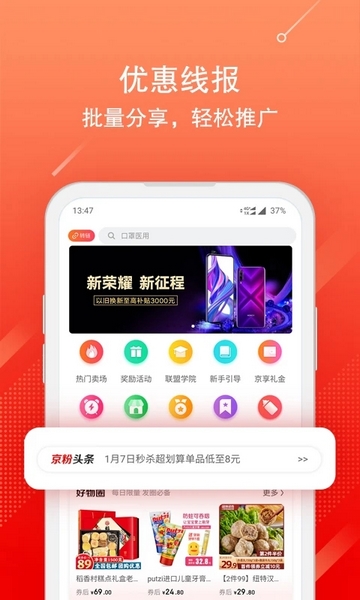 首图焦点包含今日主推的京东促销活动,下方的活动模块聚集了近期精选的优惠活动,一键分享,给你的用户更多选择