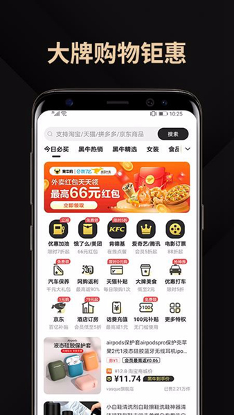 黑牛购APP是一款主打在线网购优惠省钱的软件,如果想要省钱也能过精致生活,买优质好物,那么不如试试这款软件吧!其致力于打造全网保质保真的优质购物平台,界面清爽大气,商品丰富齐全,汇集海量优质商品随心挑选,且种类繁多,囊括数码、服装、食品、美妆、家居、母婴等应有尽有,满足用户的购物需求!同时平台还网罗了淘宝、天猫等购物平台的优惠活动、大额券等内容,让你购物更优惠!不仅如此,更有优惠加油、KFC折扣、爱奇艺会员打折等优惠,让你省钱享受优质生活!