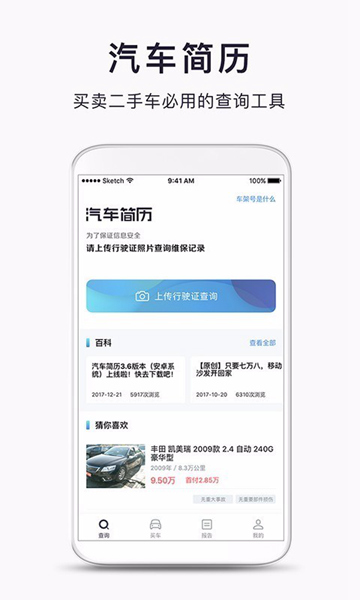 软件功能也挺多的,比如估价、上传行驶证查维保记录,甚至还有汽车百科教你怎么买车避雷。价格分析也很实用,对比市场行情,避免被坑。新用户还能有5次免费查询机会,这点很贴心。