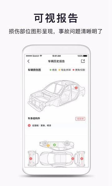 1、线上查询车辆历史报告,损伤部位图形呈现,事故问题清晰明了;